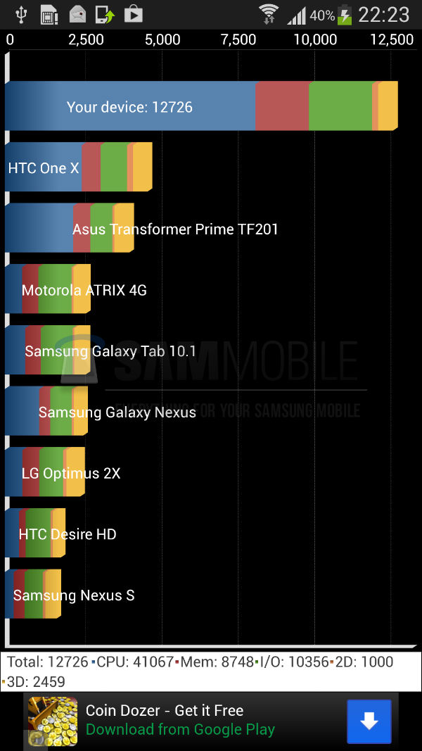 Όπως αποκαλύπτει το Quadrant, το Galaxy S4 με Exynos 5 Octa επεξεργαστή, έφτασε τους 12,726 πόντους, που σημαίνει ότι είναι περίπου 2,5 φορές γρηγορότερος από τον τετραπύρηνο του HTC One X. Όμως τα πράγματα δεν είναι και τόσο καλά όταν συγκρίνουμε με τον τωρινό ανταγωνισμό. Οι τέσσερις επιπρόσθετοι πυρήνες βοήθησαν το Galaxy S4 να φύγει λίγο πιο μακριά από τη τετραπύρηνη παραλλαγή του στη δοκιμή του AnTuTu, η οποία με τη σειρά της πέρασε για μερικούς πόντους το One της HTC, όπως είδαμε εδώ.