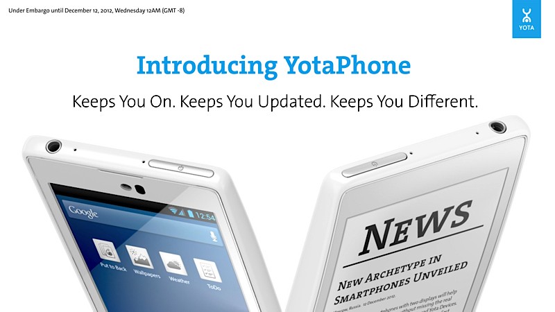 Η Ρώσικη εταιρία YotaPhone ανακοίνωσε το πρώτο της smartphone, το οποίο είναι και το πρώτο smartphone που έχει και δεύτερη οθόνη στο πίσω μέρος του. Το κινητό αυτό έχει μία κανονική LCD οθόνη αφής στο μπροστινό μέρος (4.3 ιντσών, ανάλυση 1280 x 720) και στο πίσω μέρος υπάρχει μία ασπρόμαυρη E-Ink οθόνη στο ίδιο μέγεθος, και οι δύο με επικάλυψη Gorilla Glass. Η δεύτερη οθόνη θα εμφανίζει πληροφορίες και ειδοποιήσεις για το κινητό, και επίσης θα μπορεί να διαβάζει ο χρήστης κείμενα και βιβλία καλύτερα από την LCD, αφού είναι και αυτού του τύπου που συναντάμε στα eBook readers.