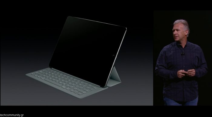 Τέλος, η αμερικάνικη εταιρία ανακοίνωσε και δύο πανάκριβα αξεσουάρ για το tablet. Το ένα είναι το Smart Keyboard που ουσιαστικά αντιγράφει το πληκτρολόγιο του Microsoft Surface, αλλά σε αντίθεση με εκείνο έρχεται με το μηχανισμό του πληκτρολογίου του MacBook και διπλώνεται για να χρησιμοποιείται σαν βάση. Συνδέεται με το tablet με το ‘Smart Connector’ που βρίσκεται στα πλάγια του tablet (δεν συνδέεται με Bluetooth).