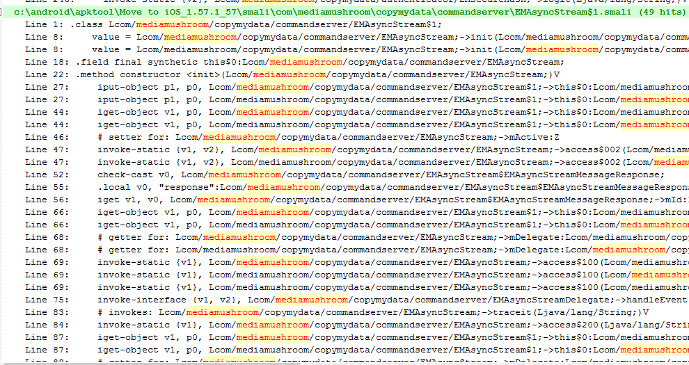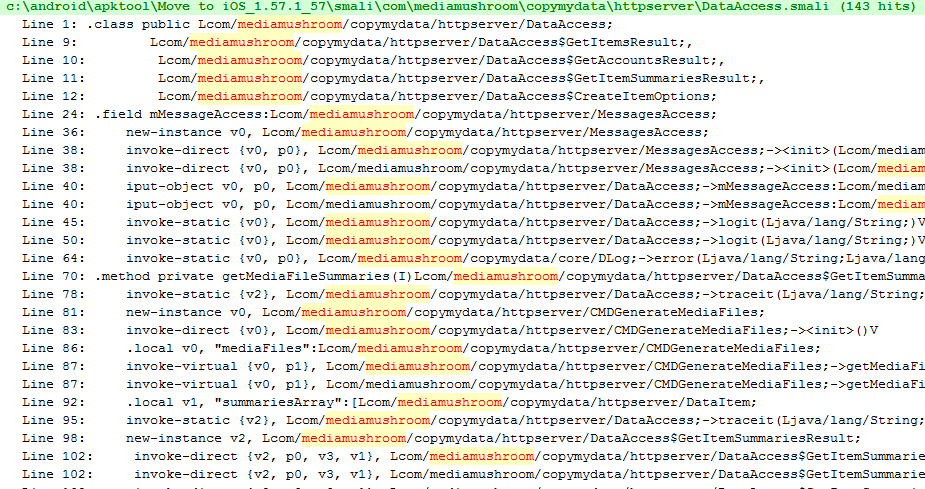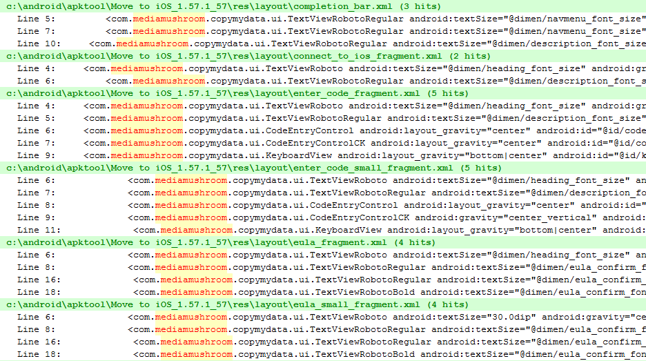 Όσοι ξέρουν από προγραμματισμό Android εφαρμογών θα παρατηρήσουν ότι το όνομα πακέτου είναι package=”com.apple.movetoios” ενώ το android:name παραμένει android:name=”com.mediamushroom.copymydata”. Και αυτό δεν είναι η μόνη αναφορά στον κώδικα. Συνέχεια αναφέρεται το όνομα της εταιρίας που ανέπτυξε το Copy My Data.