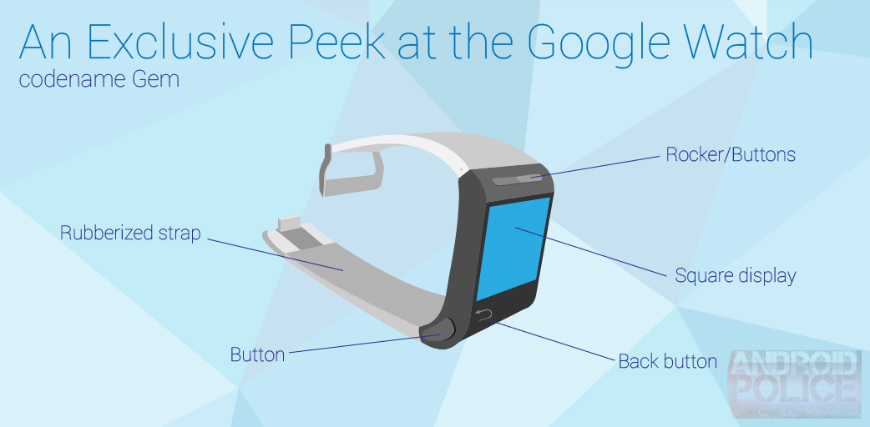 Σύμφωνα με μια ανώνυμη πηγή, η συσκευή θα ονομαζόταν Google Watch, με επίσημη κωδική ονομασία Gem, και θα βρισκόταν στην οικογένεια των Nexus συσκευών. Οι εικόνες από το Android Police δείχνουν πως θα ήταν το Nexus smartwatch και φαίνεται να ήταν το αντίθετο από όμορφο και με μεγάλη μπαταρία που ετοιμάζει για φέτος η Motorola στα χέρια της Lenovo. Από τις φωτογραφίες βλέπουμε το λογότυπο της Motorola στο μπροστινό μέρος, τη τετράγωνη έγχρωμη οθόνη και ένα κρυμμένο USB στο πλαστικό λουράκι από το οποίο θα φόρτιζε και θα συνδεόταν στον υπολογιστή. Κάτω από την οθόνη είναι το κουμπί «πίσω», στα πλάγια έχουμε ένα ακόμα κουμπί και πάνω από την οθόνη βρίσκονται και άλλα δύο κουμπιά τα οποία ενεργοποιούν την λειτουργία υγείας και το Google Now αντίστοιχα.