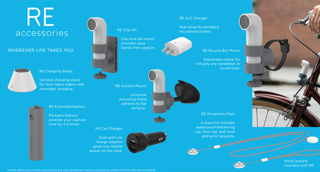 Η RE πρόκειται για μια πολύ μικρή, λεπτή και ελαφριά κάμερα που για σκόπευτρο και οθόνη χρησιμοποιεί το κινητό με το οποίο συνδέεται μέσω Bluetooth 4.0 ή Wi-Fi 802.11 a/b/g/n (Wi-Fi Direct). Η χρήση της είναι αρκετά απλή: με το πάτημα μιας φοράς του κύριου κουμπιού στο πίσω μέρος τραβάς φωτογραφίες, με το συνεχόμενο πάτημα ενεργοποιείται η εγγραφή βίντεο, ενώ με το πάτημα του μπροστινού κουμπιού αρχίζει η εγγραφή βίντεο αργής κίνησης. Η σύνδεση γίνεται με όλα τα Android (με 4.3 ή νεότερη έκδοση) και αργότερα με Apple συσκευές με iOS 7 ή νεότερη έκδοση, και για να δείτε τις λήψεις, ή να τραβήξετε νέες εικόνες/βίντεο, χρειάζεστε την αντίστοιχη επίσημη εφαρμογή.