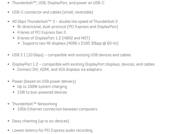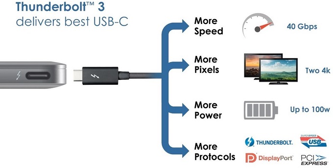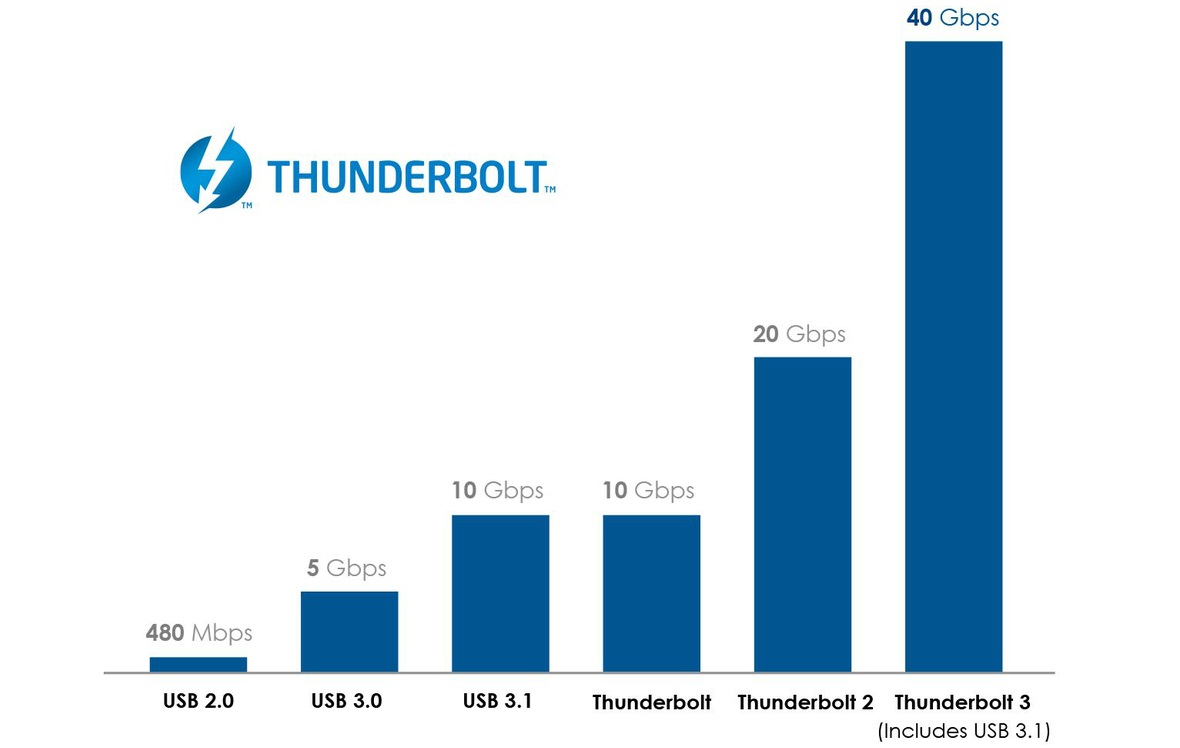 Το νέο Thunderbolt 3 χρησιμοποιεί ένα USB-C connector αντί για Mini DisplayPort το οποίο έχει τις ίδιες δυνατότητες με το USB-C αλλά όταν συνδέεται σε συμβατές συσκευές μπορεί να μεταφέρει δεδομένα με ταχύτητες που φτάνουν έως και τα 40Gbps! Δηλαδή έχει το διπλάσιο throughput σε σχέση με το προηγούμενη έκδοση του Thunderbolt. Επίσης μπορεί να χρησιμοποιηθεί για σύνδεση δύο οθονών με 4K ανάλυση ή για σύνδεση μίας οθόνης με ανάλυση 5K στα 60Hz, κάτι που μέχρι στιγμής δεν ήταν εφικτό.