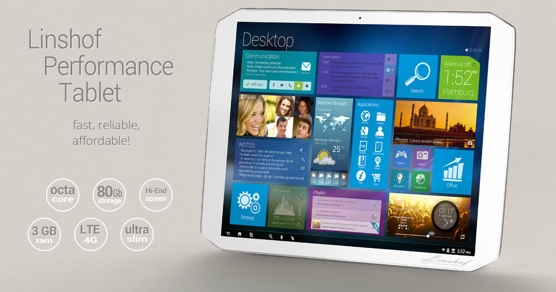 Η εταιρία όμως σκοπεύει να κάνει μια ακόμη δυναμική είσοδο, αυτή τη φορά στην αγορά των tablets, με το επίσης ξεχωριστό Linshof Performance Tablet. Το νέο tablet ακολουθεί πιστά την σχεδιαστική γραμμή με τις οκτώ γωνίες που έθεσε η νεοσύστατη εταιρία για τα προϊόντα της, ενώ τα τεχνικά χαρακτηριστικά του, όμοια με αυτά του ομόνυμου smartphone, το καθιστούν μια από τις κορυφαίες συσκευές στη κατηγορία του.