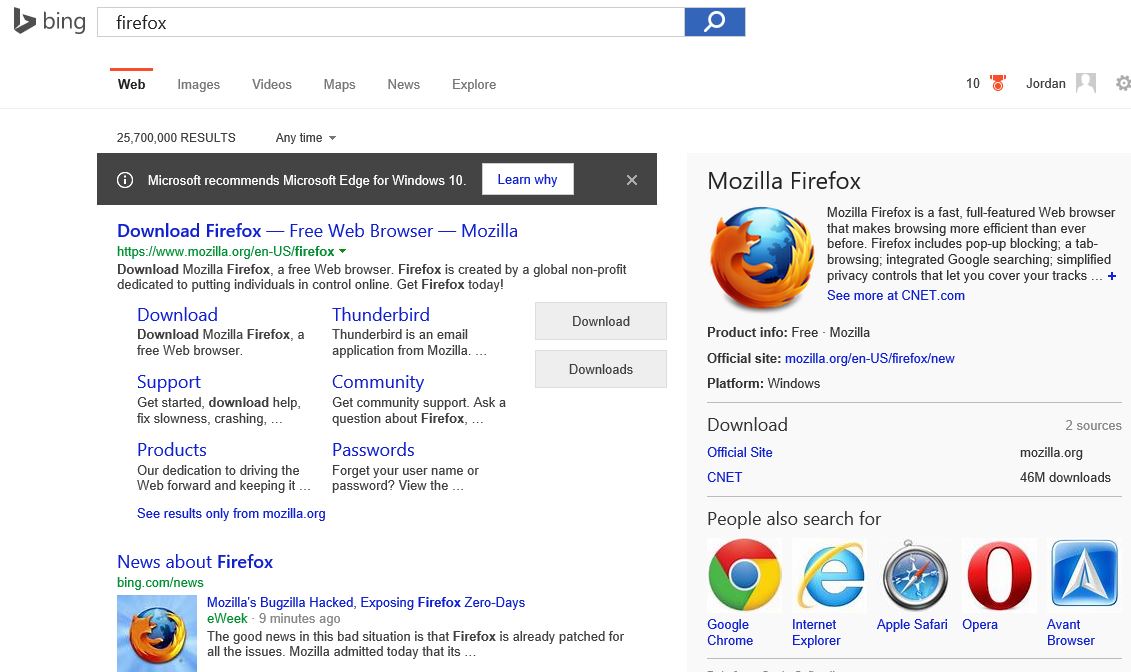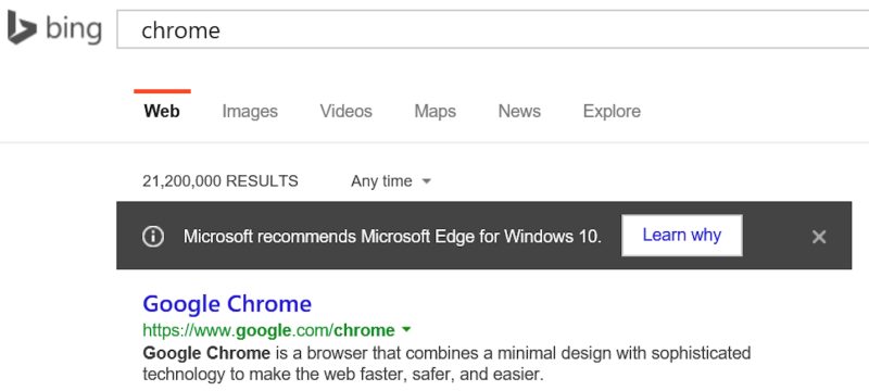 Όπως αποκαλύπτουν χρήστες του εξωτερικού, η εταιρία αποθαρρύνει τους χρήστες από το χρησιμοποιούν browsers από άλλες εταιρίες, όπως τον Google Chrome ή τον Mozilla Firefox. Συγκεκριμένα, όταν ο χρήστης ανοίγει τον Edge στα 10 και γράφει στο Bing το όνομα ενός άλλου φυλλομετρητή για να τον κατεβάσει, μια σκούρα μπάρα πάνω από τα αποτελέσματα γράφει «Η Microsoft συνιστά Microsoft Edge για Windows 10» και δίπλα υπάρχει ένα κουμπί «Μάθετε γιατί» που ανοίγει μια διαφημιστική ιστοσελίδα του Edge η οποία αυτή τη στιγμή δεν είναι διαθέσιμη στην Ελλάδα.