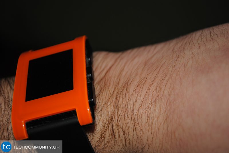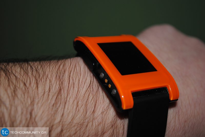 Το Pebble είναι όλο από πλαστικό. Στα αριστερά βρίσκεις μόνο το κουμπί για επιστροφή στη προηγούμενη οθόνη, ενώ δεξιά είναι τρία κουμπιά για πάνω, κάτω και ‘οκ’ ή επιλογή. Στη αριστερή μεριά είναι επίσης και το μέρος όπου κάθεται ο φορτιστής μέσω μαγνητών για φόρτιση. Στη πίσω μεριά αναγράφεται το “Made in China” μαζί με τον σειριακό αριθμό.
