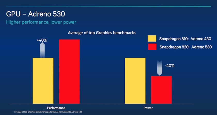 Η Qualcomm τώρα μας ενημερώνει πως το 820 χρησιμοποιεί τη κάρτα γραφικών Adreno 530 η οποία αποτελεί μια σημαντική αναβάθμιση σε σχέση με την Adreno 430 του 810. Όχι μόνο έχει σχεδόν τις διπλάσιες επιδόσεις (40% πάνω) αλλά καταναλώνει και 40% λιγότερη ενέργεια. Αυτό σημαίνει ότι θα υποστηρίζει δύο φορές καλύτερα παιχνίδια και η διάρκεια ζωής της μπαταρίας θα αυξηθεί για περισσότερο παιχνίδι.